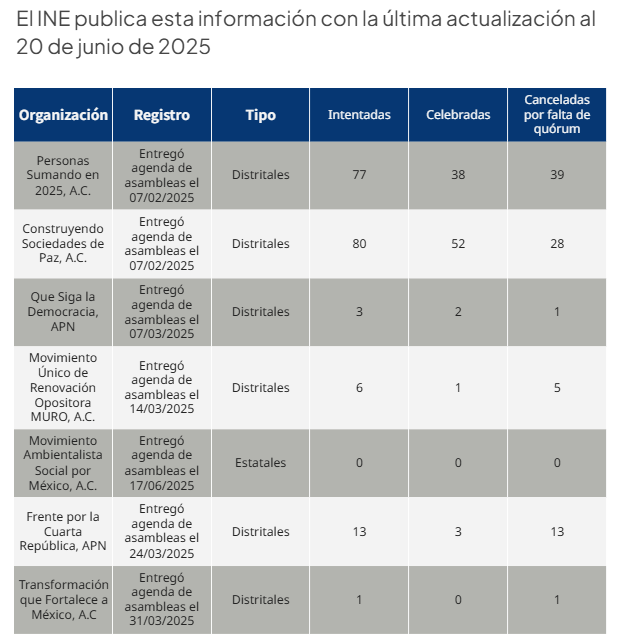 De acuerdo con la actualización del Instituto Nacional Electoral (INE), al 20 de junio sólo habían presentado su agenda de asambleas siete de las 82 organizaciones que buscan el registro. De las cuales, la mayoría fueron anuladas al no cumplir con la asistencia mínima: 300 personas en asambleas distritales o tres mil en estatales, según hayan elegido.