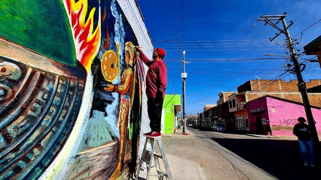 El artista plástico Gerardo Velázquez, por ejemplo, está pintando la herencia muralista y escultórica de los hermanos José y Tomás Chávez Morado, representándolos como caballeros Jaguar y Águila en una atmósfera prehispánica.