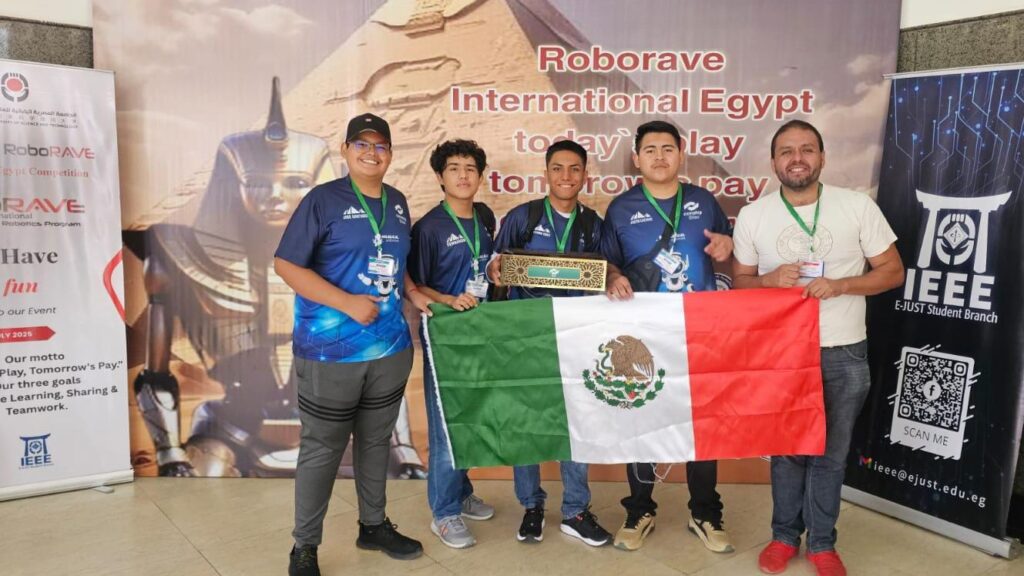 Silao, Gto.; 5 de julio de 2025.- El equipo ‘Sumo Másters’ del plantel Silao del CONALEP conquistó el primer lugar en la categoría Fast Bot Hight School del Torneo Internacional de Robótica RoboRAVE 2025, celebrado en Alejandría, Egipto.