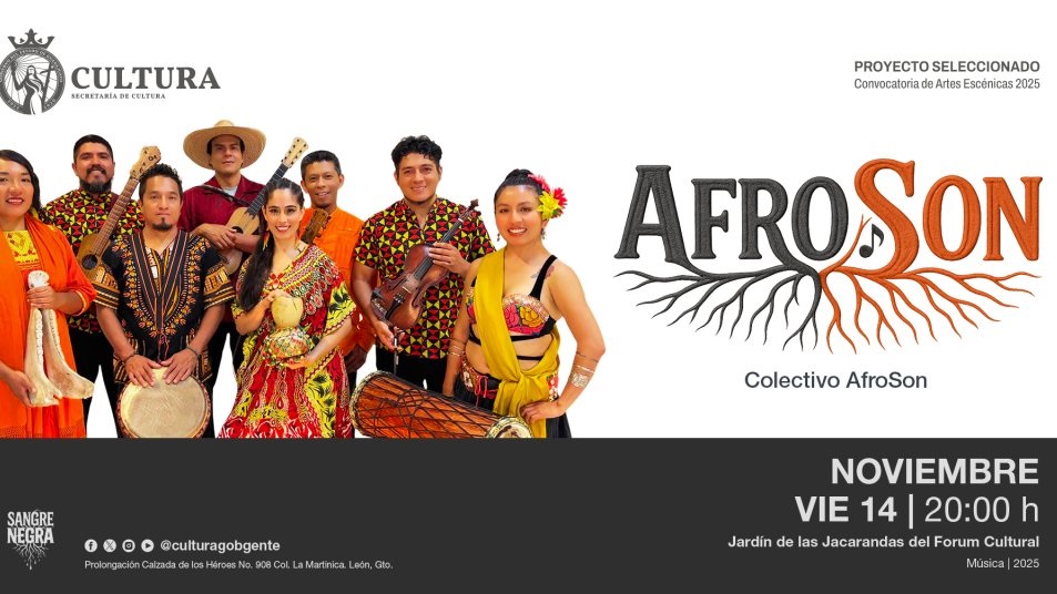 León, Guanajuato, 12 de noviembre de 2025. La Secretaría de Cultura de Guanajuato invita al público a disfrutar del espectáculo AfroSon, una puesta en escena interdisciplinaria que celebra la diversidad cultural de México a través de la música, la danza y la poesía. La función se llevará a cabo el viernes 14 de noviembre a las 20:00 horas en el Jardín de las Jacarandas del Forum Cultural, con acceso gratuito para todo público.