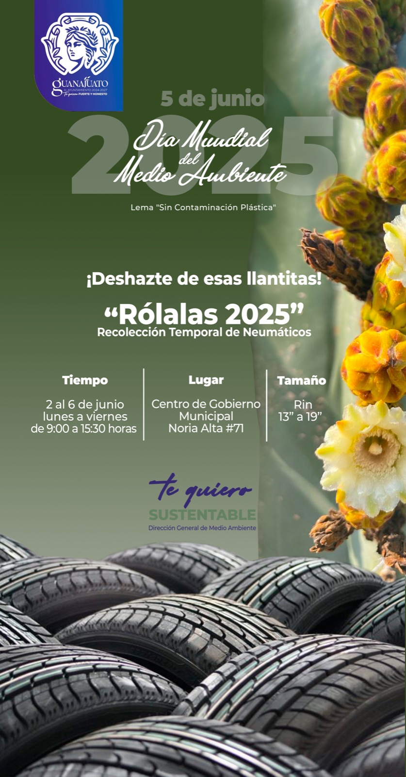 La recolección de neumáticos se llevará a partir de este lunes 2 al viernes 6 de junio de 9:00 de la mañana a las a 3:30 de la tarde en Casa Guanajuato, ubicada en Noria Alta. Las llantas serán entregadas a una empresa especializada en reciclaje de neumáticos fuera de uso, donde serán utilizadas como fuente energética.