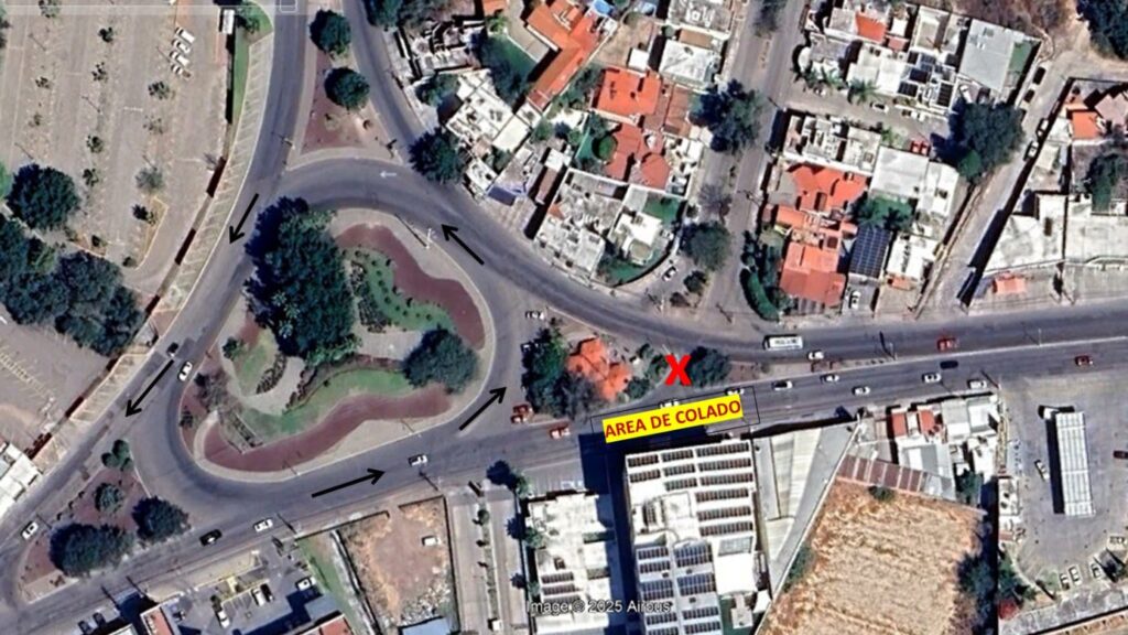 La subida, localizada frente al Hotel Concordia (pasando la glorieta), permanecerá cerrada para quienes circulen desde Cuchicuato o desciendan de Villas de Irapuato con intención de ingresar al fraccionamiento, ya que el acceso será intervenido para la aplicación del nuevo pavimento.