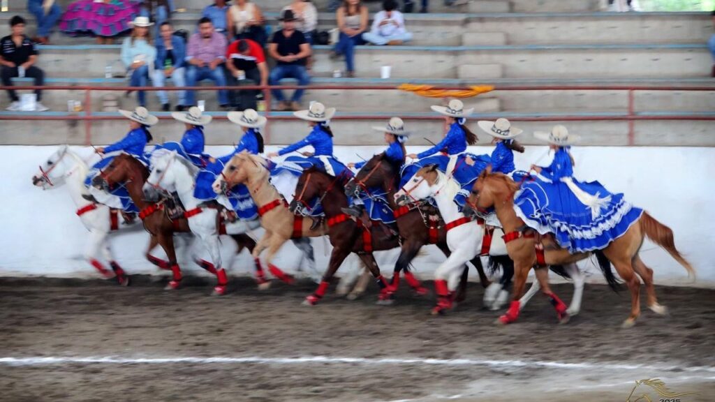 La escaramuza charra, una disciplina ecuestre femenina que conecta deporte e historia, se enmarca dentro de la charrería mexicana. Los equipos de mujeres charras, ataviadas con trajes tradicionales, realizan movimientos sincronizados a caballo y al son de la música tradicional de México. Es una modalidad grupal que denota elegancia y que muestra a plenitud las destrezas de las mujeres en el hábil manejo del caballo.